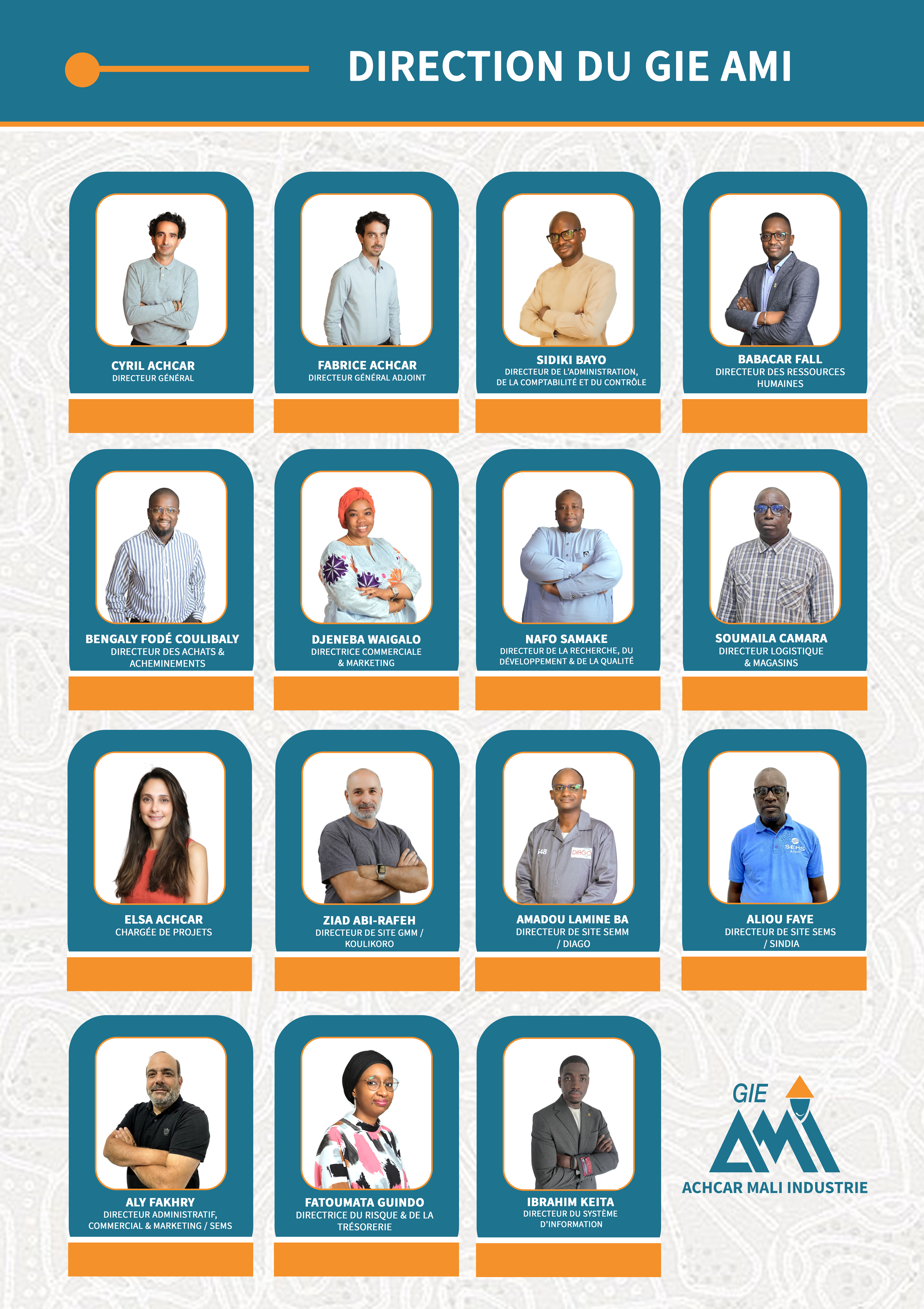 Je Suis heureux en ma qualité de Directeur Général du Groupement d’Intérêt Economique Achcar Mali Industrie de souhaiter à tous la Bienvenue sur notre site Web. Chers internautes, vous avez certainement déjà entendu parler de la Société des Eaux Minérales du Mali (SEMM), ou de la Société des Grands Moulins du Mali (GMM), ou encore de la Grande Confiserie du mali (GCM) ; ces trois entités sont les entreprises industrielles du GIE AMI auxquelles se sont rajoutées les deux sociétés de service à savoir : GAM Transit et BAGAMI. Les Sociétés du GIE AMI sont spécialisées en agroalimentaire et se sont développées progressivement depuis l’indépendance à nos jours.Nous offrons des produits de base alimentaire ; de la farine à la confiserie ; pour des consommateurs de toute tranche d’âge et de classe sociale.Bien sûr de part notre statut d’entreprise responsable et citoyenne, nous proposons des produits en adéquation parfaite avec la santé tels que notre Eau Minérale «DIAGO» certifié ISO 9001 V2015, notre farine infantile «Vitablé» ou encore notre boisson «Ami Fruité Punch» spécialisé Diabétique.Les trois grandes industries sont situées dans la capitale Bamako pour GCM, à Koulikoro (55kms de Bamako) pour GMM et à Diago (35kms de Bamako) pour SEMM.L’ensemble du groupement emploie 700 personnes en emplois directs et presque autant en emplois indirects. Nous sommes une équipe dynamique et motivée qui vise l’excellence. Nous sommes l’un des plus grands groupements industriels du Mali et nous aspirons toujours à un développement régional. Je souhaiterai que les usagers que vous êtes, tiriez le plus grand profit de ce forum d’échange interactif à votre disposition.Tout le plaisir est le nôtre de vous offrir cette plateforme de présentation du groupement, tout en vous invitant à nous contacter. Merci à tous et Bonne navigation,